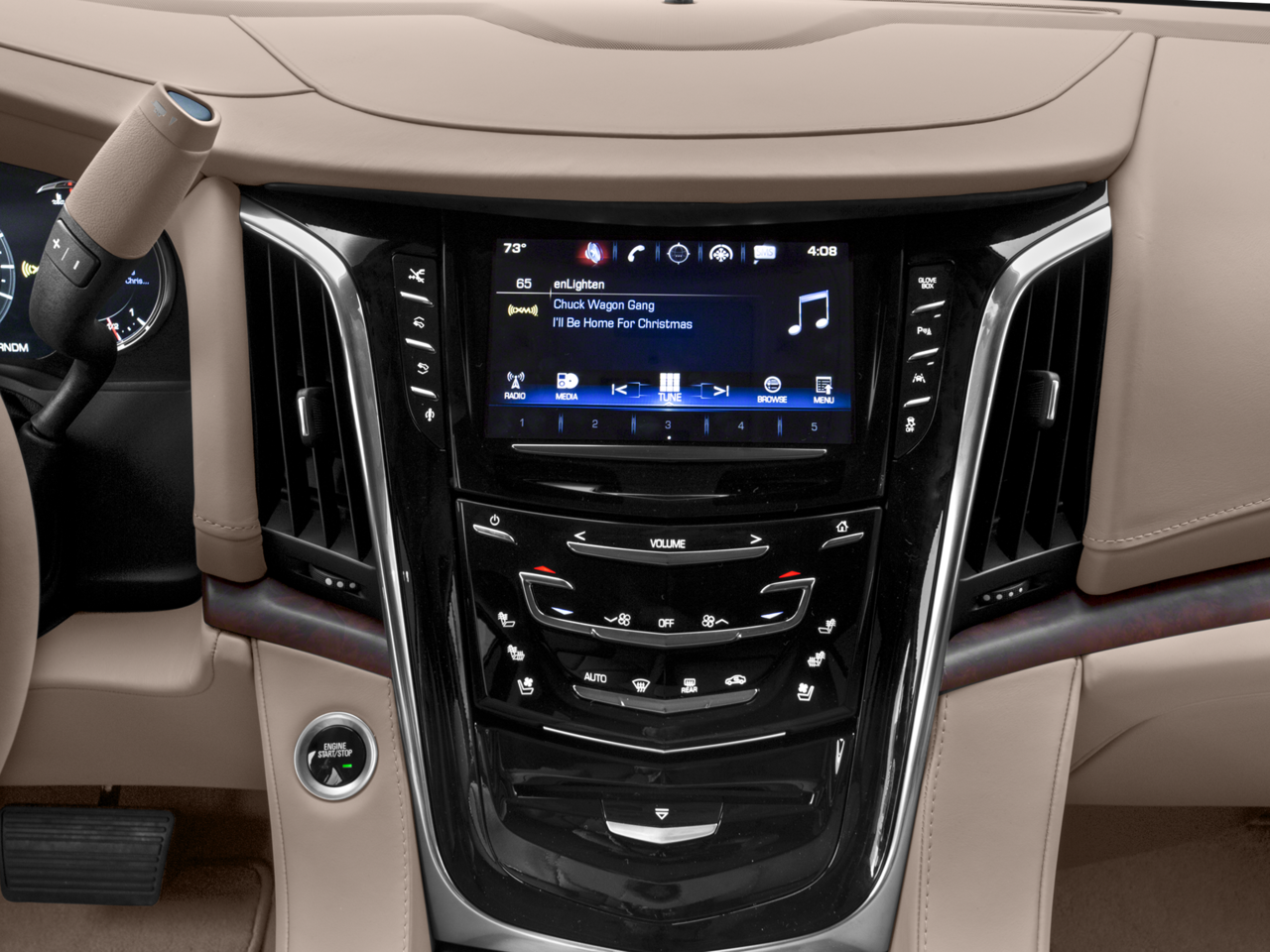 INTERIOR PROTECTION PACKAGE includes (VAV) all-weather floor mats, LPO and (VLI) all-weather cargo mat, CADILLAC CUE INFORMATION AND MEDIA CONTROL SYSTEM WITH EMBEDDED NAVIGATION 8 diagonal color information display featuring touch response, haptic feedback, gesture recognition, Natural Voice Recognition, Phone Integration for Apple CarPlay and Android Auto capability for compatible phone, Collection and Teen Driver. Five USB ports, including one in the articulating storage door/bin and auxiliary audio port (STD), ENGINE, 6.2L V8 WITH ACTIVE FUEL MANAGEMENT Spark Ignition Direct Injection (SIDI) and Variable Valve Timing (VVT), includes aluminum block construction (420 hp [313.2 kW] @ 5600 rpm, 460 lb-ft of torque [621 N-m] @ 4100 rpm) (STD), 8L90 (STD). Cadillac Platinum with CRYSTAL WHITE TRICOAT exterior and TUSCAN BROWN interior features a 8 Cylinder Engine with 420 HP at 5600 RPM*.