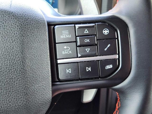 EQUIPMENT GROUP 802A RAPTOR 37 Dual Valve Shocks, Wheels: Raptor 37 Unique 17 Cast Aluminum, Bead lock capable, Carbon Fiber Interior Appliques, Modular Front Bumper, Tires: 37x12.5R17 BSW All-Terrain, GVWR: 7,400 lbs, TWIN PANEL MOONROOF, TRANSMISSION: ELECTRONIC 10-SPEED AUTOMATIC SelectShift w/paddle shifters and terrain management modes: normal, sport, tow-haul, slippery, rock crawl, off-road and baja (STD). Ford Raptor with Shelter Green exterior and Rhapsody Blue interior features a V6 Cylinder Engine with 450 HP at 5850 RPM*.